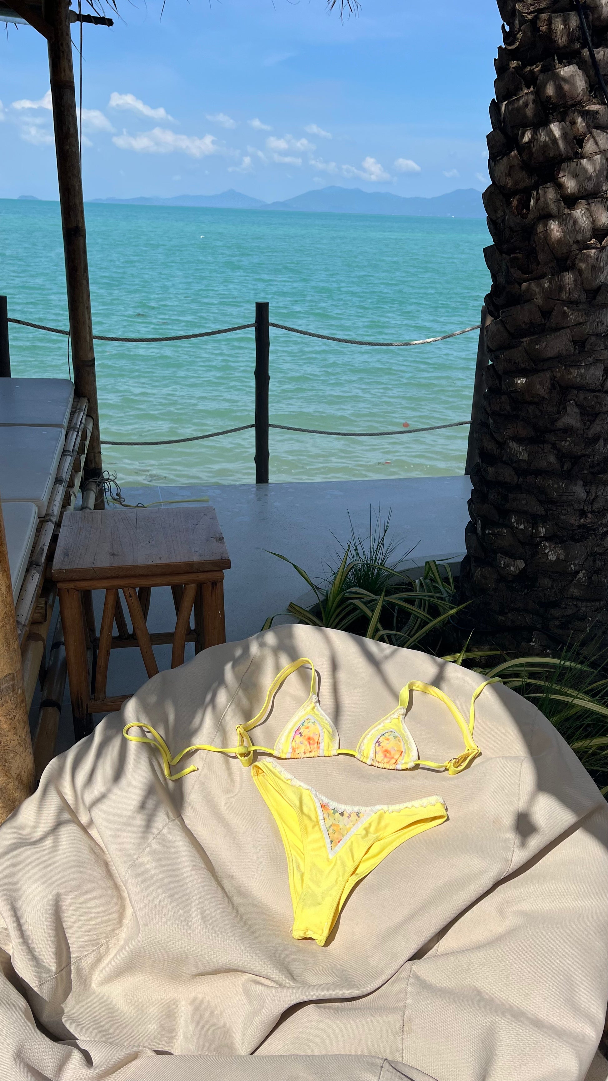 CATALEYA swimsuit in a summery yellow, featuring delicate lace and a soft floral print. The adjustable triangle top ensures a perfect fit and maximum comfort. The mid-rise Brazilian-cut bottoms flatter the figure, creating a feminine and effortless look.